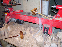 Bill wanted to show everyone both the spindles he made. The one with the dark (black walnut) handle is "MINE"! He's been having so much fun making them. Not being a spinner himself he's been relying on what I say and what he reads. I also have about 8 spindles for him to compare against. These are the same weight or less of my favorite spindle which is kinda large. Its hard to get perspective. The Lathe is NOT a huge machine.. its called a Midi Lathe because its a fraction of the normal size. He used wood from tree limbs from our yard.. Maple and Cherry. The Black Walnut was from a small piece of wood his friend Lynn Weekly gave him YEARS ago. Lynn was/is a very special guy. We lost track of him after his back surgery. He went on the road in his motorhome. I hope he's enjoying life like he always did. I sure appreciate the beautiful piece of wood he gave us. If for some reason he sees this "CALL" damn it!